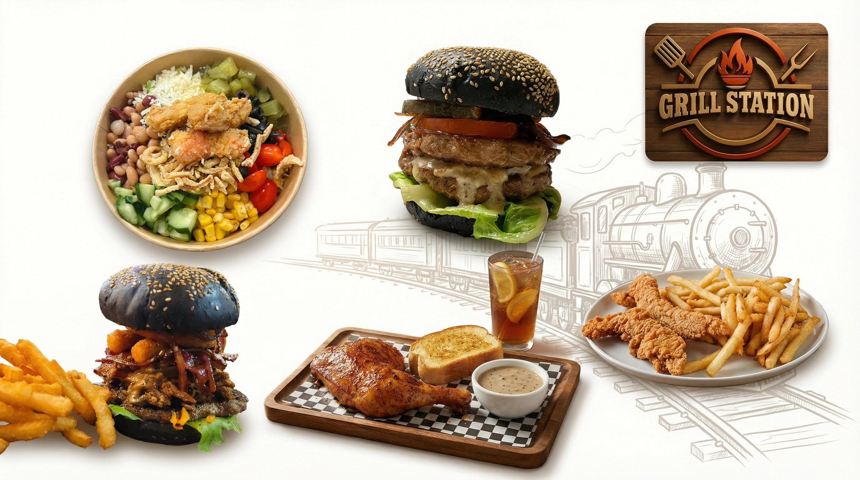 Welcome aboard to a place where great journeys begin with great food. At Grill Station, we fire up premium grilled dishes and craft our own homemade sauces to bring you bold, comforting flavor in every bite. Wrapped in a cosy, nostalgic ambiance inspired by classic rail travel, our space is built to bring people together — friends, families, neighbours, and travellers alike. This isn't just a restaurant; it's a home on the tracks, where every visit feels like coming back to your favourite stop.